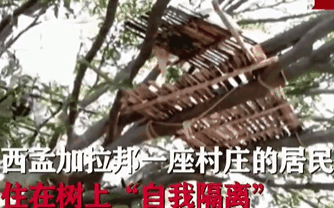 开挂的印度民众,爬上高高的树顶,在树枝间用竹子和木头搭好“地基和棚顶”,隔离点就自制完成了。