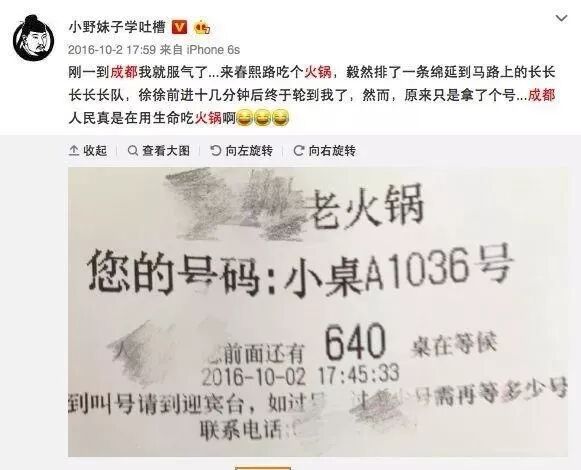 “排队难,难于上青天”“外地人到成都必打卡火锅店”“朋友圈炫耀神器”… 小龙坎火锅创造的排队神话,一点都不亚于茶饮届的喜茶。其中,微博著名大V“小野妹子学吐槽”的两次小龙坎经历也是不忍直视。