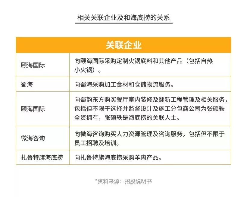 海底捞涉足了整个火锅产业链的上游,包括食材供应、底料供应、人力资源、装修等,每一环节都成立了公司独立运作。并且这些供应链公司都对外开放,向其他公司提供服务,海底捞餐厅只是供应链公司合作方之一。比如火锅底料供应商颐海国际,早于海底捞在港股上市,颐海国际只有50%的收入来自于海底捞关联交易。