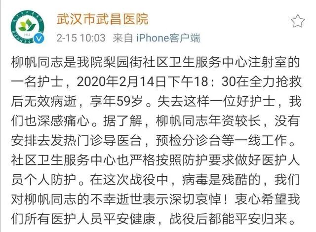 2月15日,武汉市武昌医院官方微博发布通报,称该院梨园街社区卫生服务中心注射室护士柳帆于2月14日病逝,享年59岁。