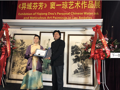 圣盖博前市长廖钦和市议员、西科维纳副市长吴桐怀到场祝贺讲话并给艺术家颁发了荣誉证书。世界名人俱乐部负责人闫俊安,阳光教育学院代表郑总,好莱坞电影学院代表为画家颁发杰出艺术家和客座教授证书。著名华裔油画家、美利坚合众国文联主席阿原为艺术家颁发了证书。中华艺术宫鲁安馆长颁发收藏证书给艺术家。艺术家窦一琼捐赠了书画给以上学校和机构收藏。并表示以后有机会回到学校教孩子们画水墨画和工笔画。