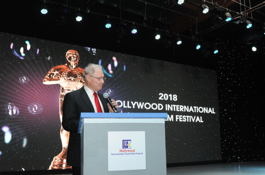 好莱坞是世界著名的影都,好莱坞市前市长Steve Martin 上台讲话。鼓励年轻人热爱电影事业,预祝青年电影节圆满成功!